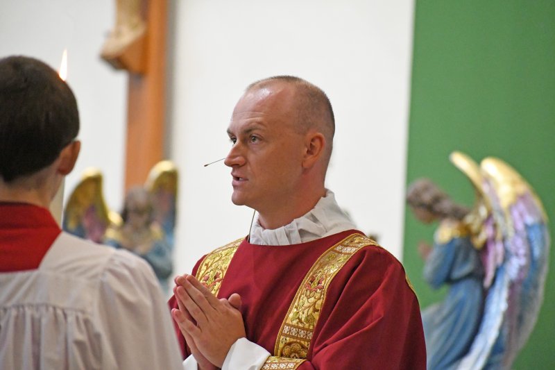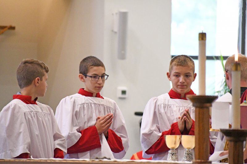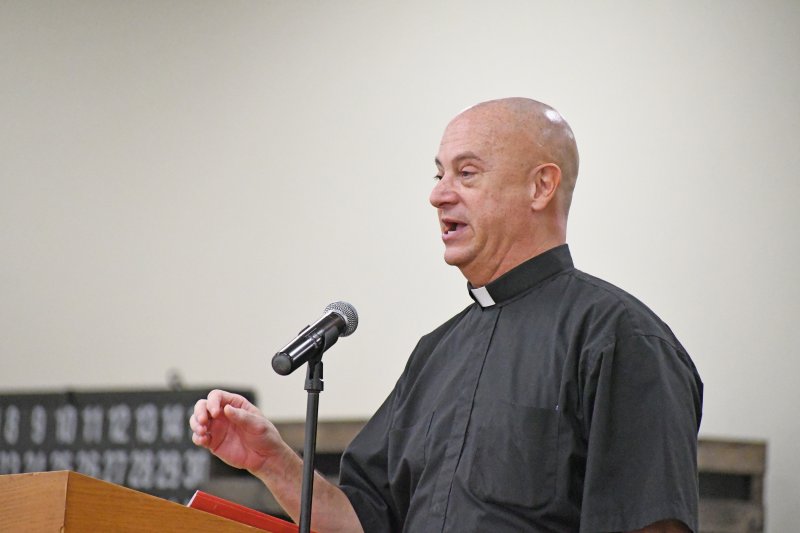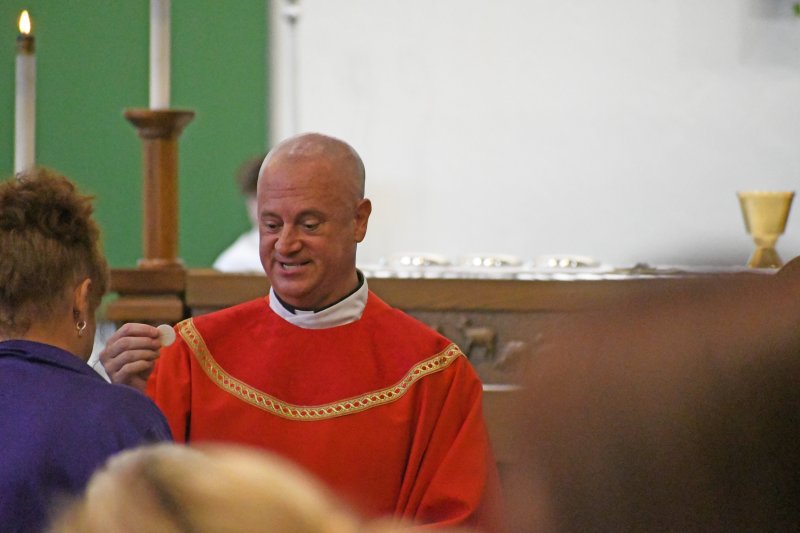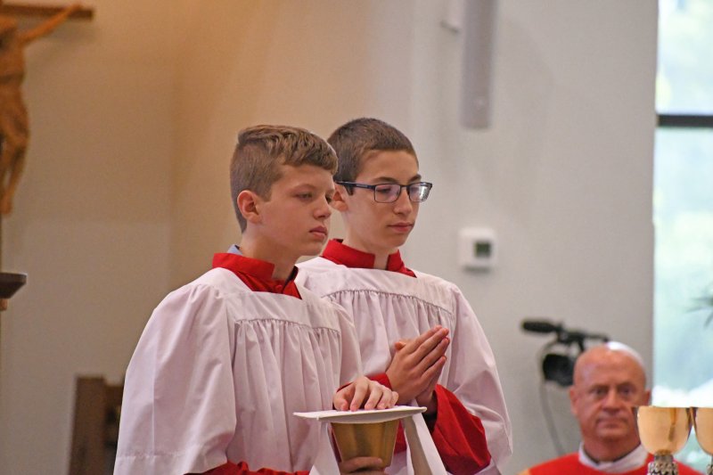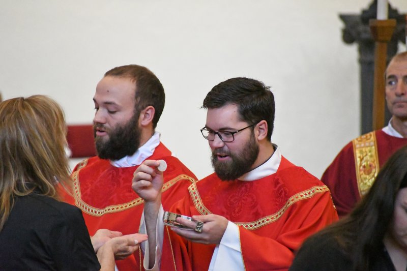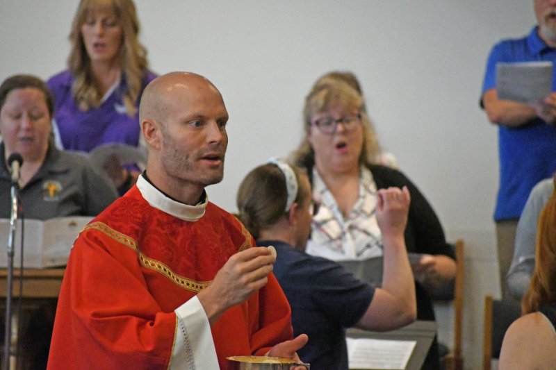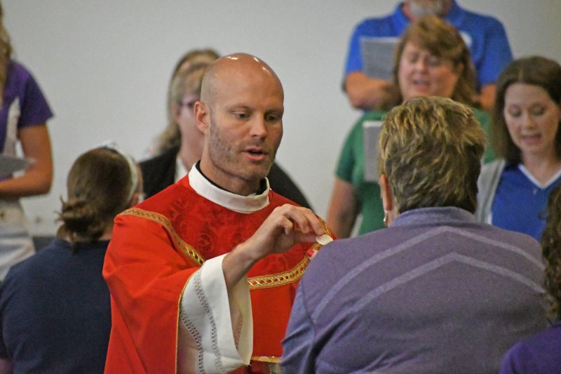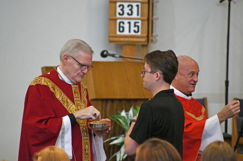 Father Caleb Scherzinger, left, and Father Phillip Rogier distribute communion during the Back to School Mass Aug. 1 at Good Shepherd Church. The Message photo by John Rohlf
