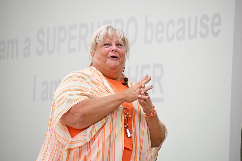 A diocesan educator wears the cape given at the end of the presentation. The Message photo by John Rohlf