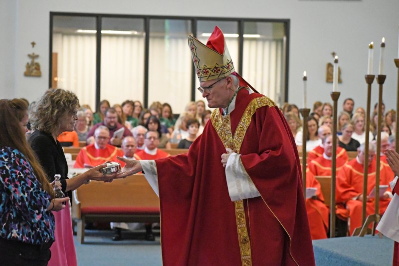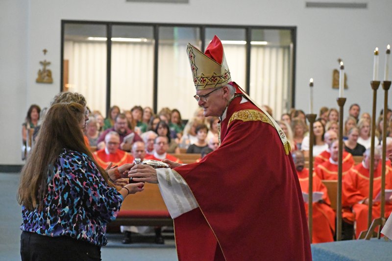 Bishop Joseph M. Siegel, right, accepts the gifts from Resurrection Principal Nancy Dukes and St. Benedict Cathedral Principal Megan Wright. Dukes and Wright are entering their first year as principals in the diocese. The Message photo by John Rohlf