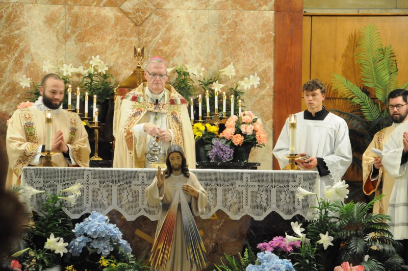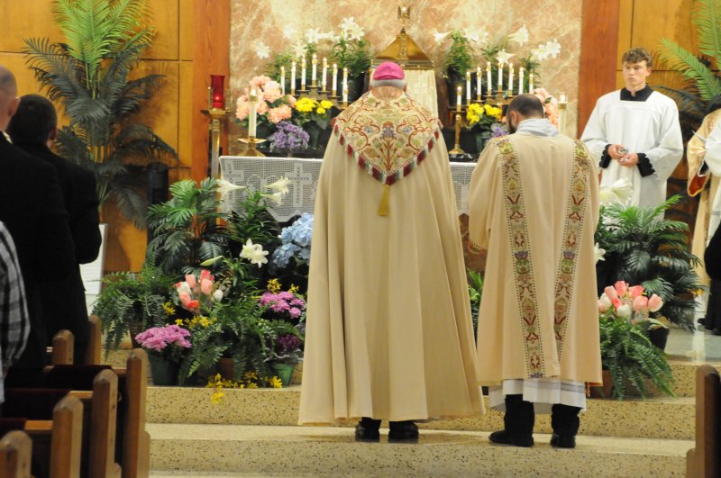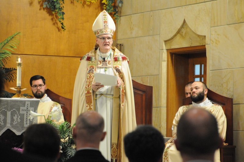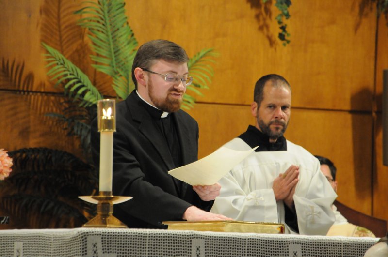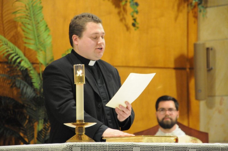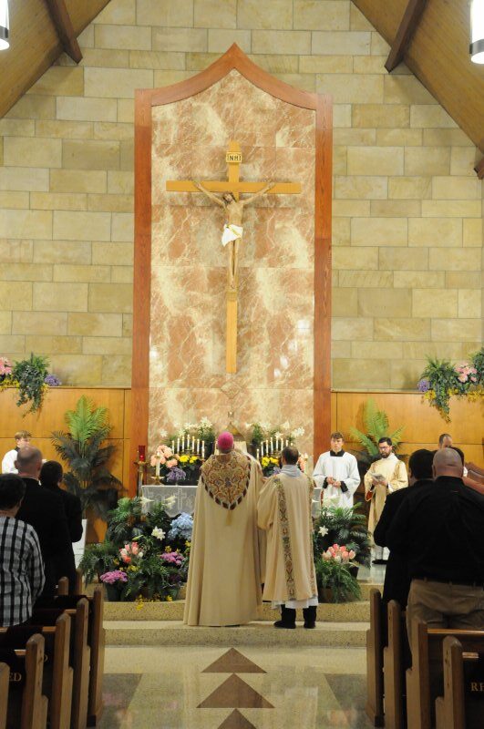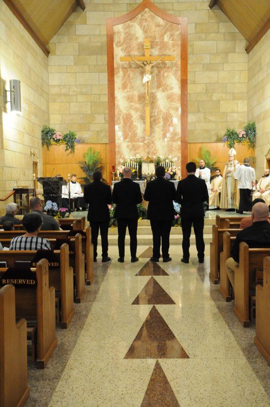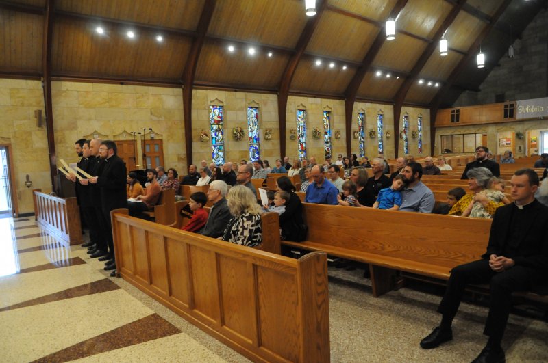 Diocese of Evansville candidates for holy Orders Nick Biever, Keith Hart, Aaron Herrenbruck and Clint Johnson make a Profession of Faith and an Oath of Fidelity in the presence of Bishop Joseph M. Siegel April 9 at Holy Cross Parish in Fort Branch. Following the evening of prayer and ceremony, immediate family and pastors of Nick, Keith, Aaron and Clint, as well as seminarians, enjoyed dinner. The four seminarians will be ordained transitional deacons by Bishop Siegel April 20 at St. Benedict Cathedral in Evansville. The Message photos by Megan Erbacher