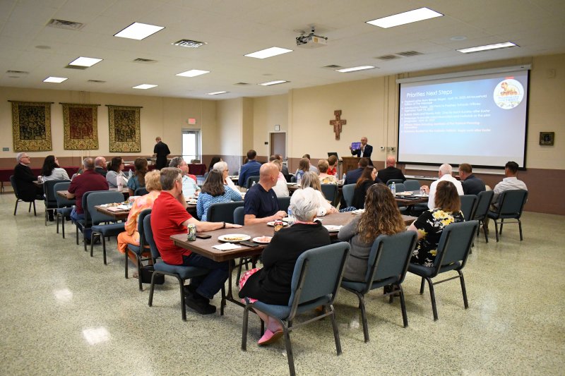 On Aug. 14, a Pastoral Priorities Lunch ‘n Learn session was held for Catholic Center and Catholic Charities staff at the Catholic Center in Evansville. Bishop Joseph M. Siegel welcomed all to the session. Diocesan Chancellor and Chief Operating Officer Dean Happe offered a few opening remarks. Diocesan Vicar General Father Alex Zenthoefer, rector of St. Benedict Cathedral, presented over the lunch hour and shared an overview of the Diocesan Pastoral Priorities. During the in-service, staff learned more about the Pastoral Priorities, shared ideas and explored how we can collectively move our Pastoral Priorities forward over the next several years. For a Pastoral Letter from Bishop Joseph M. Siegel and to learn more about our Pastoral Priorities, visit https://www.evdio.org/pastoral-priorities-2025-2030.html.