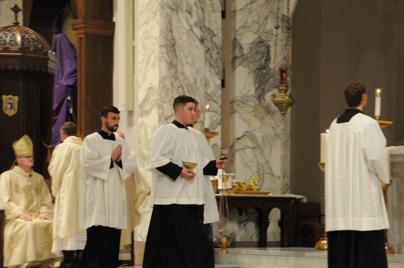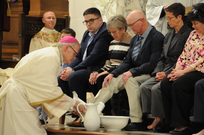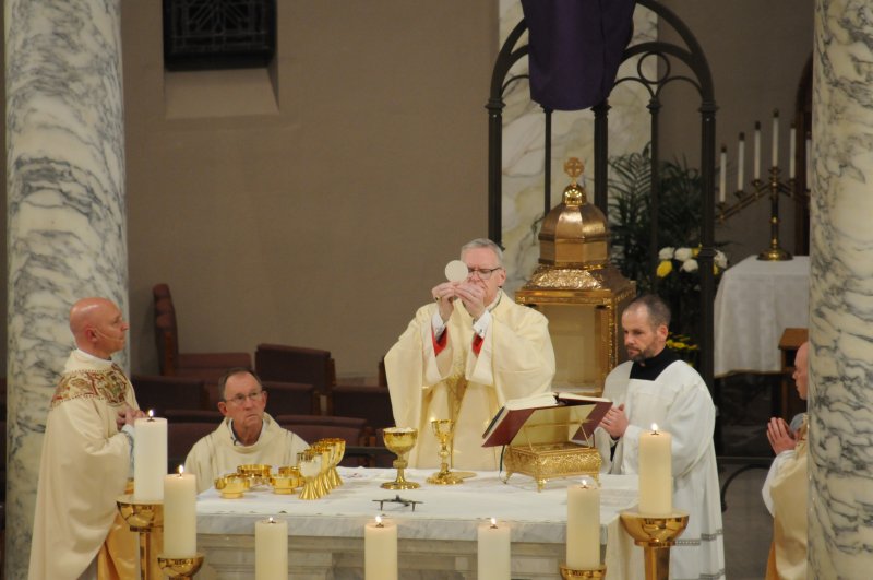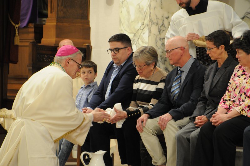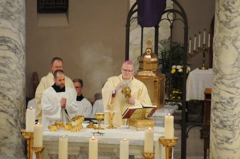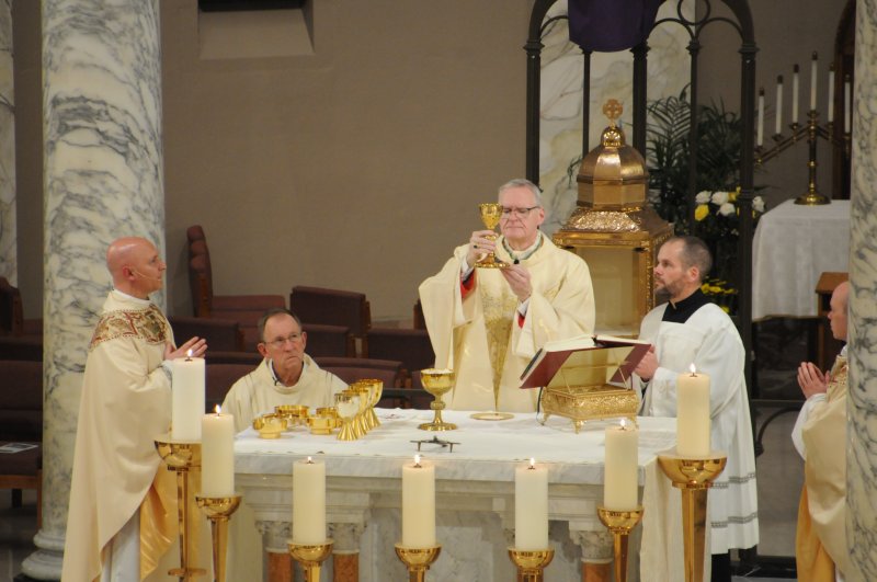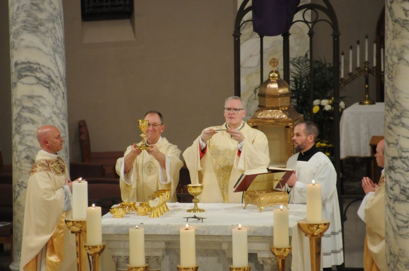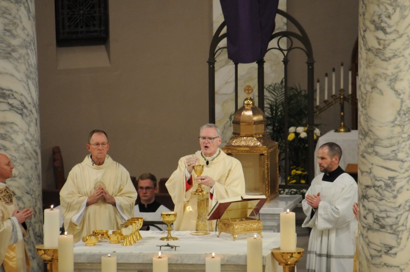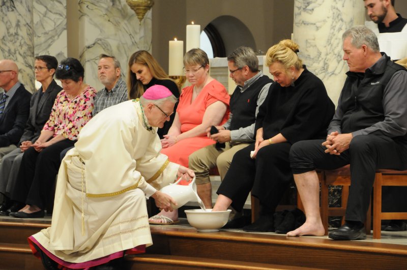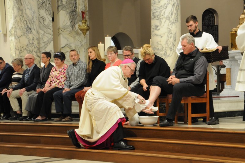 Bishop Joseph M. Siegel celebrated the Holy Thursday Mass of the Lord's Supper March 28 at St. Benedict Cathedral in Evansville. Father Alex Zenthoefer and Father Tyler Tenbarge concelebrated the Mass. The Message photos by John Rohlf