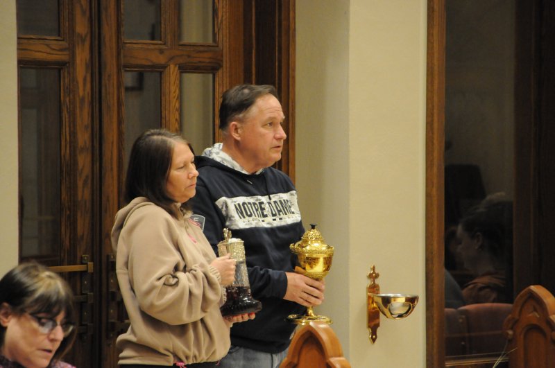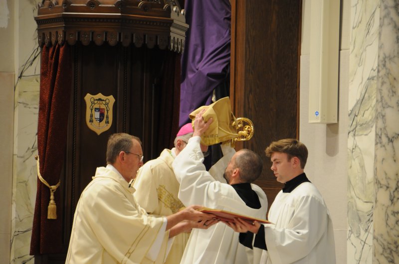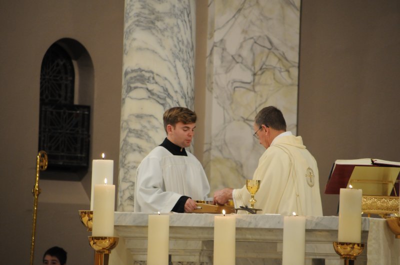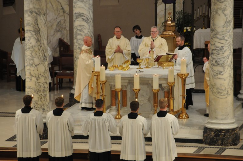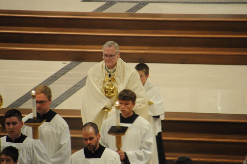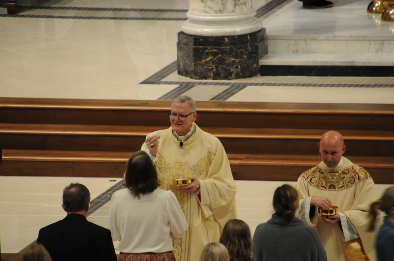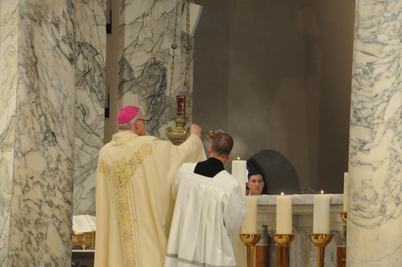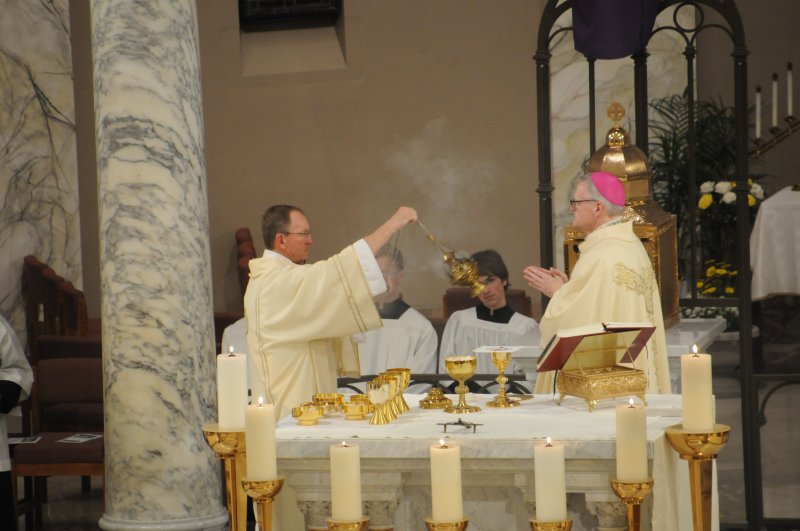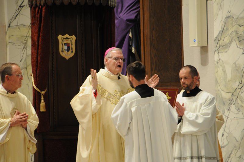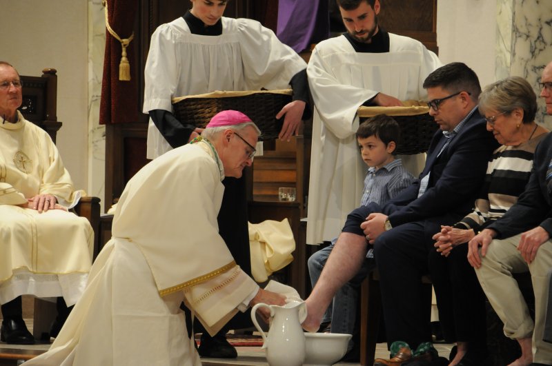 Bishop Joseph M. Siegel celebrated the Holy Thursday Mass of the Lord's Supper March 28 at St. Benedict Cathedral in Evansville. Father Alex Zenthoefer and Father Tyler Tenbarge concelebrated the Mass. The Message photos by John Rohlf