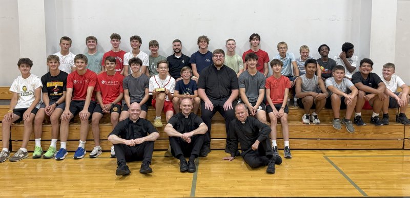 After Mass, we walked down to Washington Catholic for some pizza provided by Our Lady of Hope Outreach Committee. We had a pleasant surprise as well, as Father Tyler Tenbarge and Father Luke Hassler arrived with a van of nine more Savio guys from Evansville! In the middle school gym, we had one large group playing soccer while another went over to the high school “Birdcage” to play some basketball — even some of the dads got in on the action. The head-to-head matchup of the Savio guys verses the fathers was something to see! We closed out the event with Night Prayer, which was also a great thing to witness. Even though we had two different Savio groups, we prayed the same prayers of the Church that we’ve been familiarizing ourselves with all along.